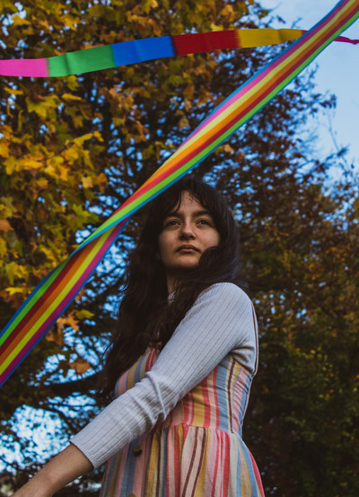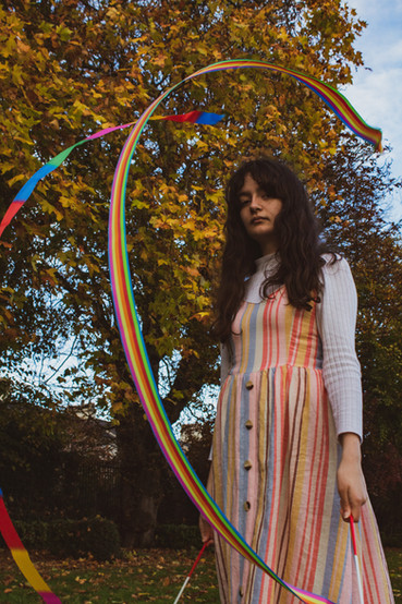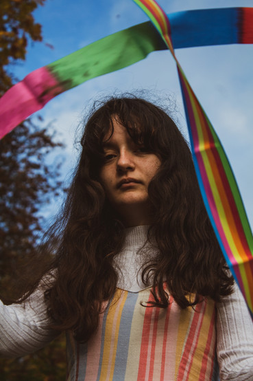 The main goal for this photoshoot was to create portraits that were fun, colourful and a little editorial, meaning the styling would play a big part in the final outcome. My lovely friend who volunteered to model this concept had a beautiful rainbow-coloured dress that we paired with a white blouse that worked really well in front of the camera, despite how initially unconventional it felt! I additionally sourced some coloured ribbons to play with, that I felt might help when it came to positioning the arms.